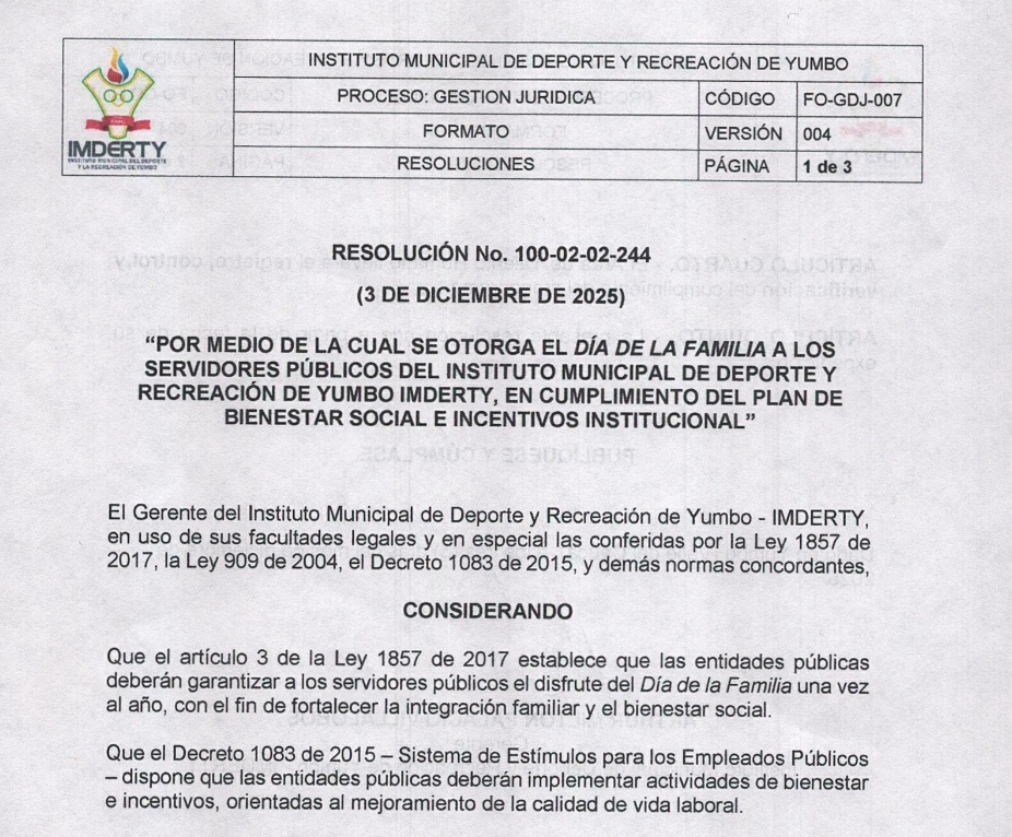 El Instituto Municipal del Deporte y la Recreación de Yumbo IMDERTY, se permite informa a todo el personal de Planta y Apoyo a la Gestión de la entidad, que el día treinta y uno (31) de octubre de dos mil diecinueve (2019), se brindará servicio a la comunidad en el siguiente horario: De 8:00 ama 12:30 m y 2:00 pm a 4:00 pm, lo anterior con el fin de brindar el tiempo necesario al personal de la entidad, para compartir con los niños que
