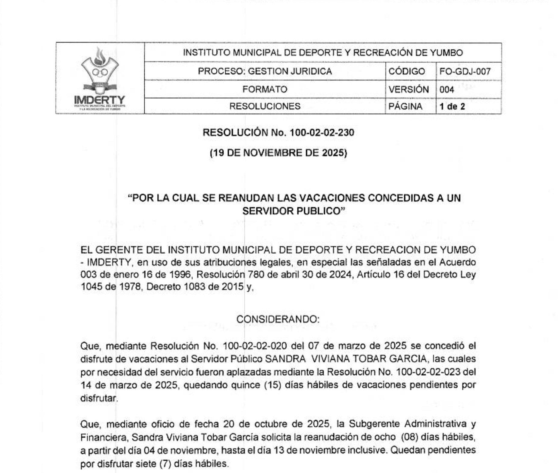 POR LA CUAL SE REANUDAN LAS VACACIONES CONCEDIDAS A UN SERVIDOR PÚBLICO