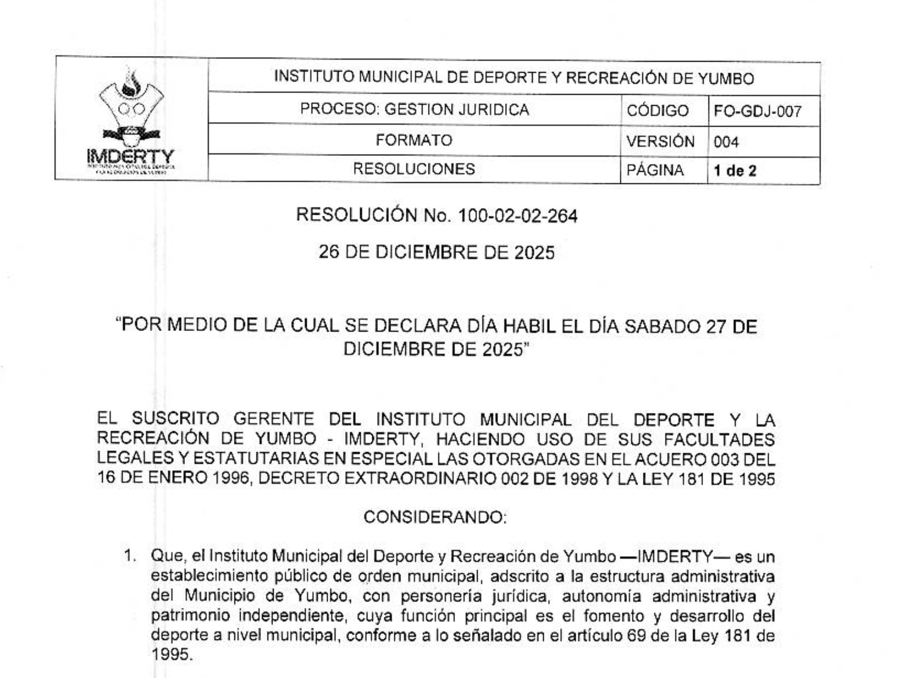 TOR MEDIO DE LA CUAL SE DECLARA DlA HÁBIL EL DÍA SABADO 27 DE DICIEMBRE DE 2025